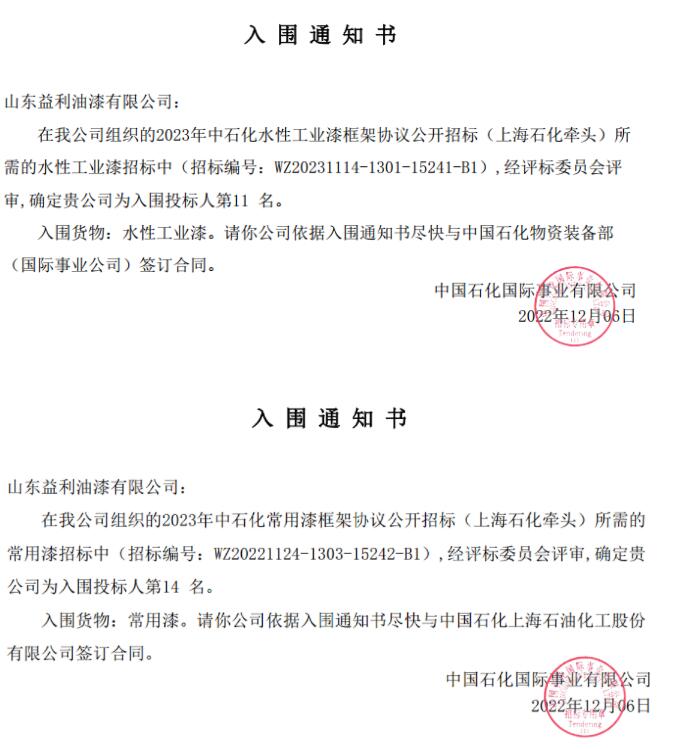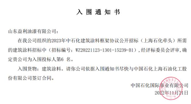 2022年11月14日,山东益利油漆有限公司参加了中国石化2023年度油漆涂料框架协议集中招标,本次中石化油漆涂料采购采用分标段投标的方式进行,竞标异常激烈。此次益利漆成功入围水性工业漆、常用漆和建筑涂料三个标段,这是对我们益利漆综合实力、品牌以及市场影响力的一个认可。