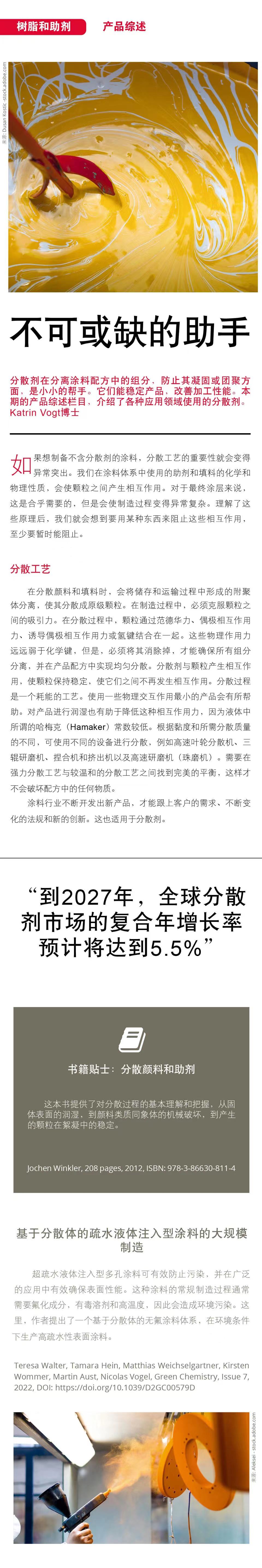 分散剂在分离涂料配方中的组分,防止其凝固或团聚方面,是小小的帮手。它们能稳定产品,改善加工性能。本期的产品综述栏目,介绍了各种应用领域使用的分散剂。 如果想制备不含分散剂的涂料,分散工艺的重要性就会变得异常突出。