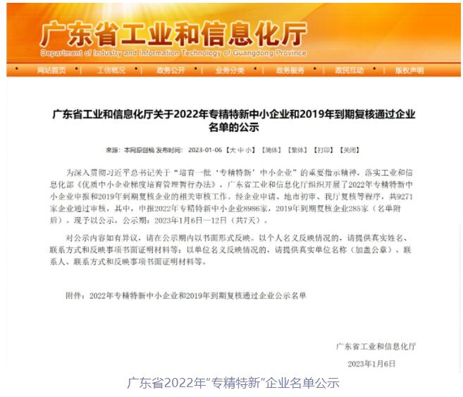 近日,广东省工业和信息化厅对审核通过的2022年专精特新企业进行了公示,巴德富集团名列其中,荣获2022年“广东省专精特新企业”认定。