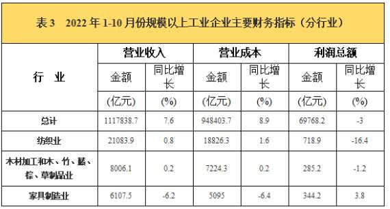 2022年1-10月全国家具制造业营业收入为6107.5亿元,同比下降6.2%;营业成本5095亿元,同比下降6.4%;利润总额344.2亿元,同比增长3.8%。