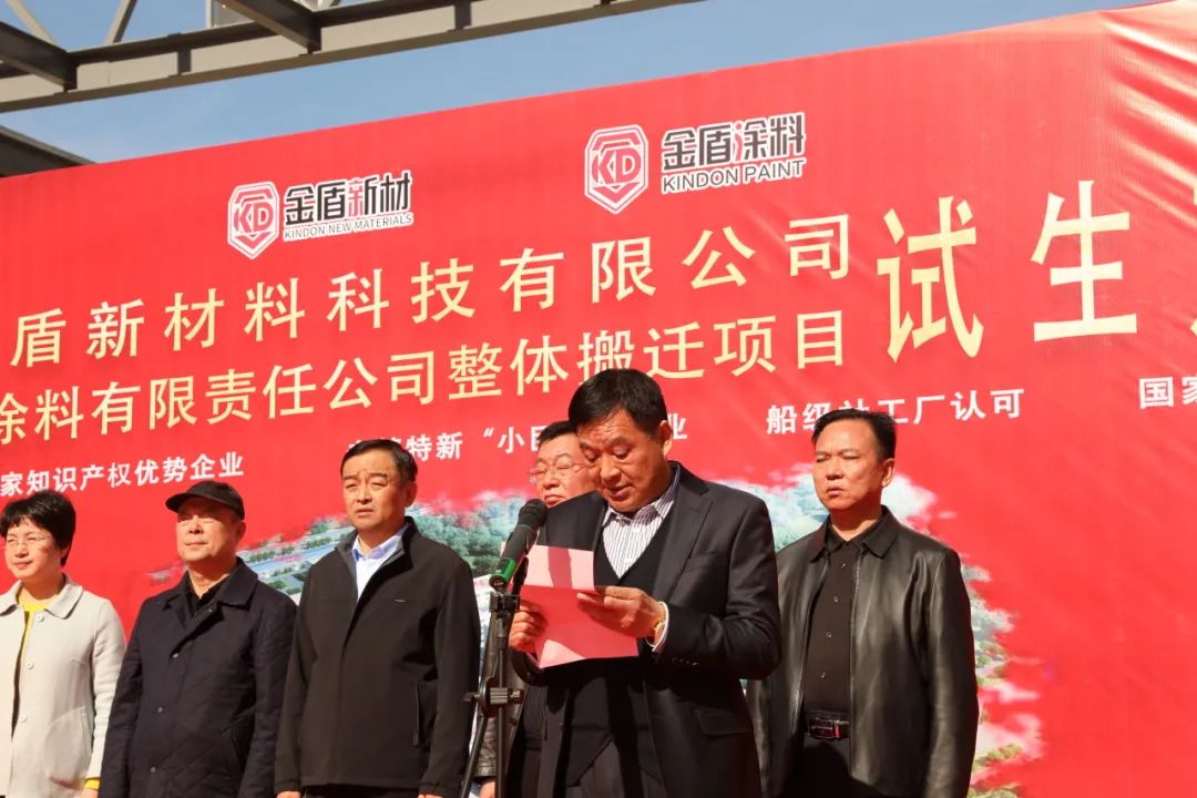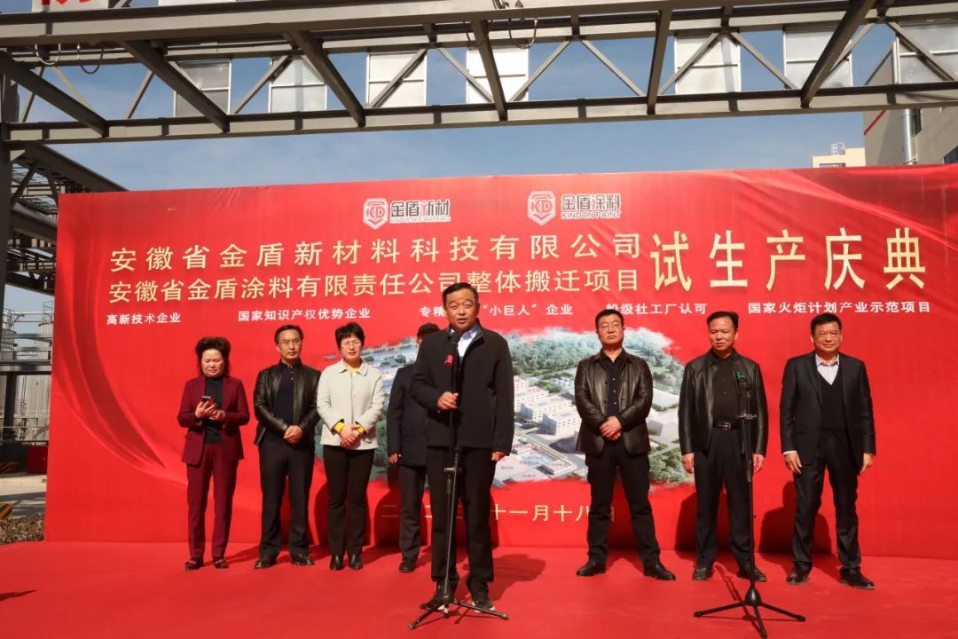 2023年11月18日安徽省金盾新材料科技有限公司暨安徽省金盾涂料有限责任公司整体搬迁项目试生产庆典在滁州天长市铜城镇化工园区隆重举行。出席本次庆典的有天长市政协党组副书记、副主席赵森华,铜城镇党委书记杨明祥,铜城镇党委副书记、镇长郑如燕,天长市政协副秘书长殷秀武,滁州市天长市生态环境分局局长王桂林,安徽省金盾新材料科技有限公司董事长董青湘、总经理梅长林,安徽省金盾涂料有限责任公司党支部书记胡兰,以及施工单位、监理单位负责人,金盾新材、金盾涂料、宏盛化学的供应商、销售商等嘉宾。庆典开始后,由金盾新材总经理梅长林介绍了金盾涂料与宏盛化学共同投资的新厂区建设情况,随后天长市政协党组副书记、副主席赵森华宣布新厂区试生产开工。