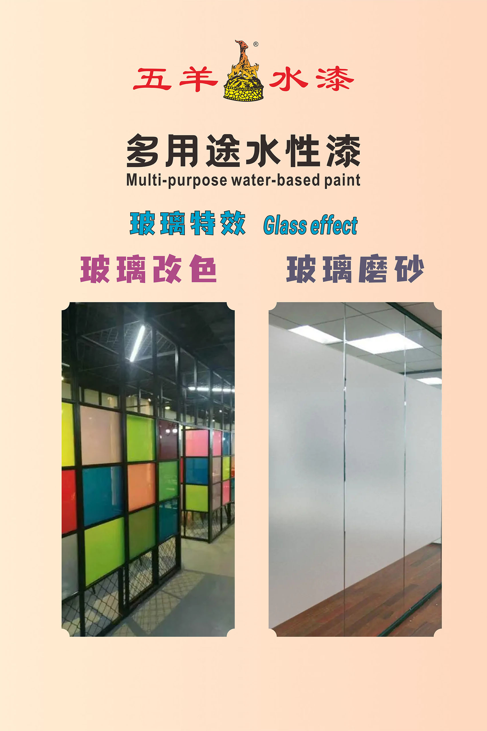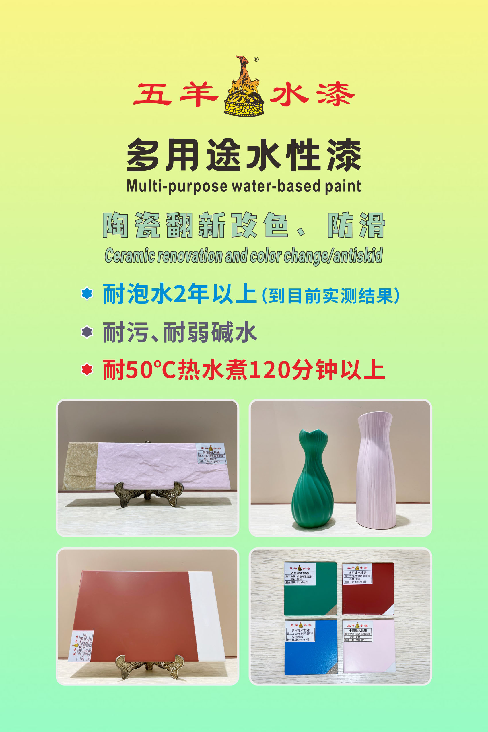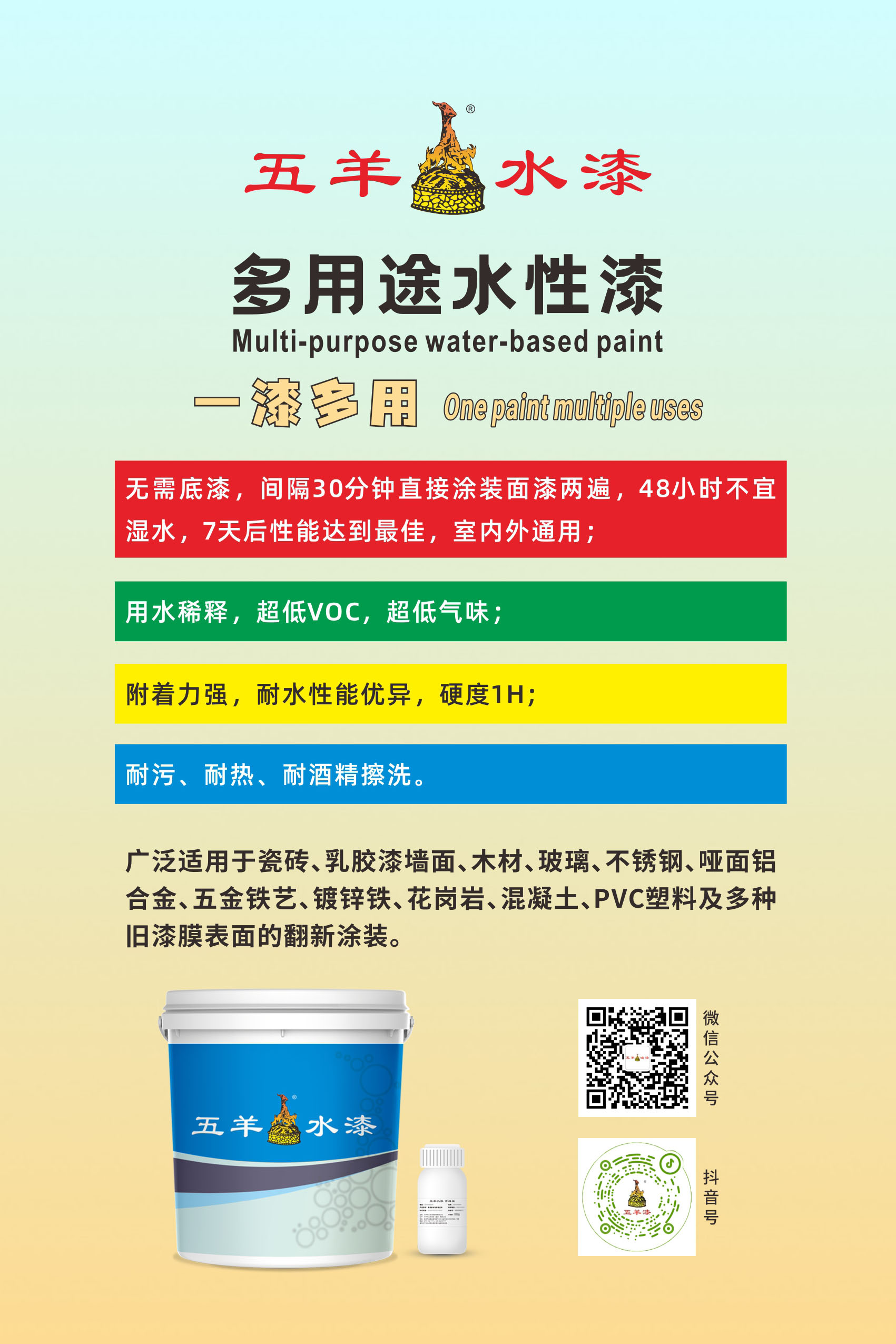 2023年隆重推出:水性多用途漆[翻新、改色] 适用范围:适用于(包括但不限于)瓷砖、玻璃、不锈钢、乳胶漆、艺术涂料墙面、木材、哑面铝合金、五金铁艺、镀锌铁、花岗岩、混凝土、PVC塑料(含PVC人造革,不含PVC透明软桌面、透明水管)及多种旧漆膜表面的翻新涂装。