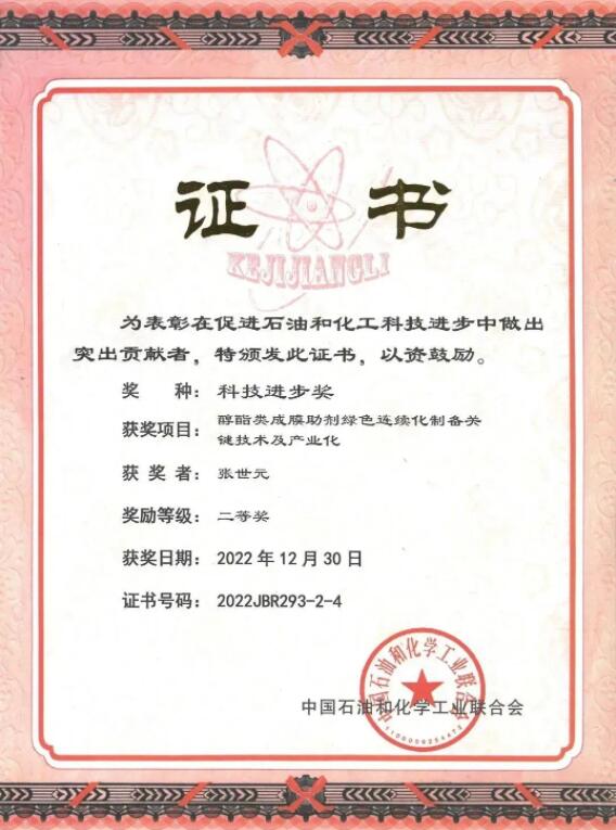 2022年度中国石油和化学工业联合会科学技术奖及专利奖授奖名单公布润泰成膜《醇酯类成膜助剂绿色制备 关键技术及产业化》项目荣获科技进步二等奖。