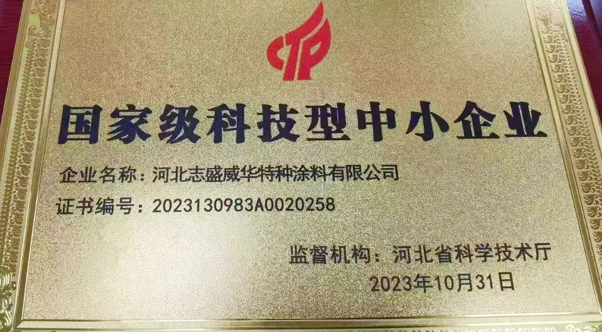 河北志盛威华特种涂料有限公司近日荣获“国家级科技型中小企业”称号!这一荣誉不仅是对我们现阶段成绩的认可和鼓励,更是我们一直坚持以产品“科技创新、技术过硬”的动力!