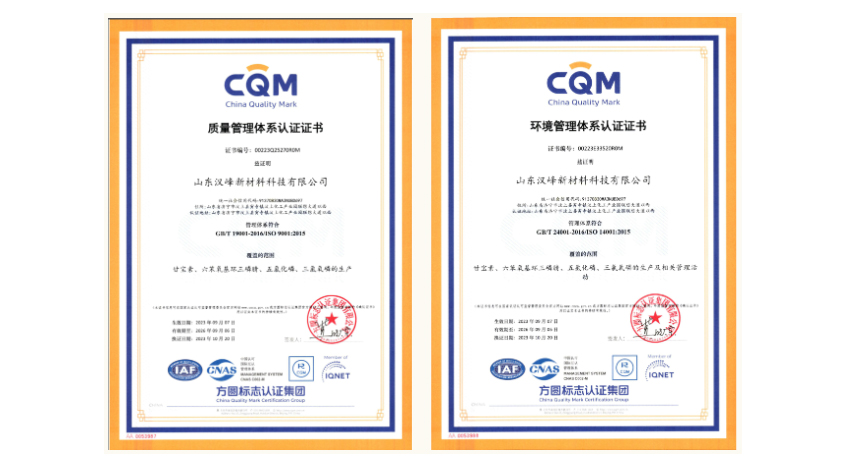 近日,山东汉峰新材料科技有限公司(简称“山东济宁生产基地”)顺利通过方圆标志认证集团审核,获得“ISO 9001质量管理体系、ISO 14001环境管理体系及ISO 45001职业健康安全管理体系”三体系认证证书和甘宝素GMP证书。