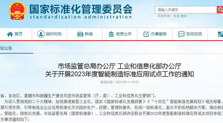 日前,国家标准化管理委员会在其官网发布公告指出:为深入贯彻党的二十大精神,加快推进新型工业化,落实《国家标准化发展纲要》《“十四五”智能制造发展规划》相关部署,发挥标准支撑引领作用,引导制造业企业运用标准化方式组织生产、经营、管理和服务,形成一批标准化、高水平的系统解决方案,推动制造业高端化、智能化、绿色化发展,市场监管总局(国家标准委)、工业和信息化部决定联合开展2023年度智能制造标准应用试点项目申报工作。