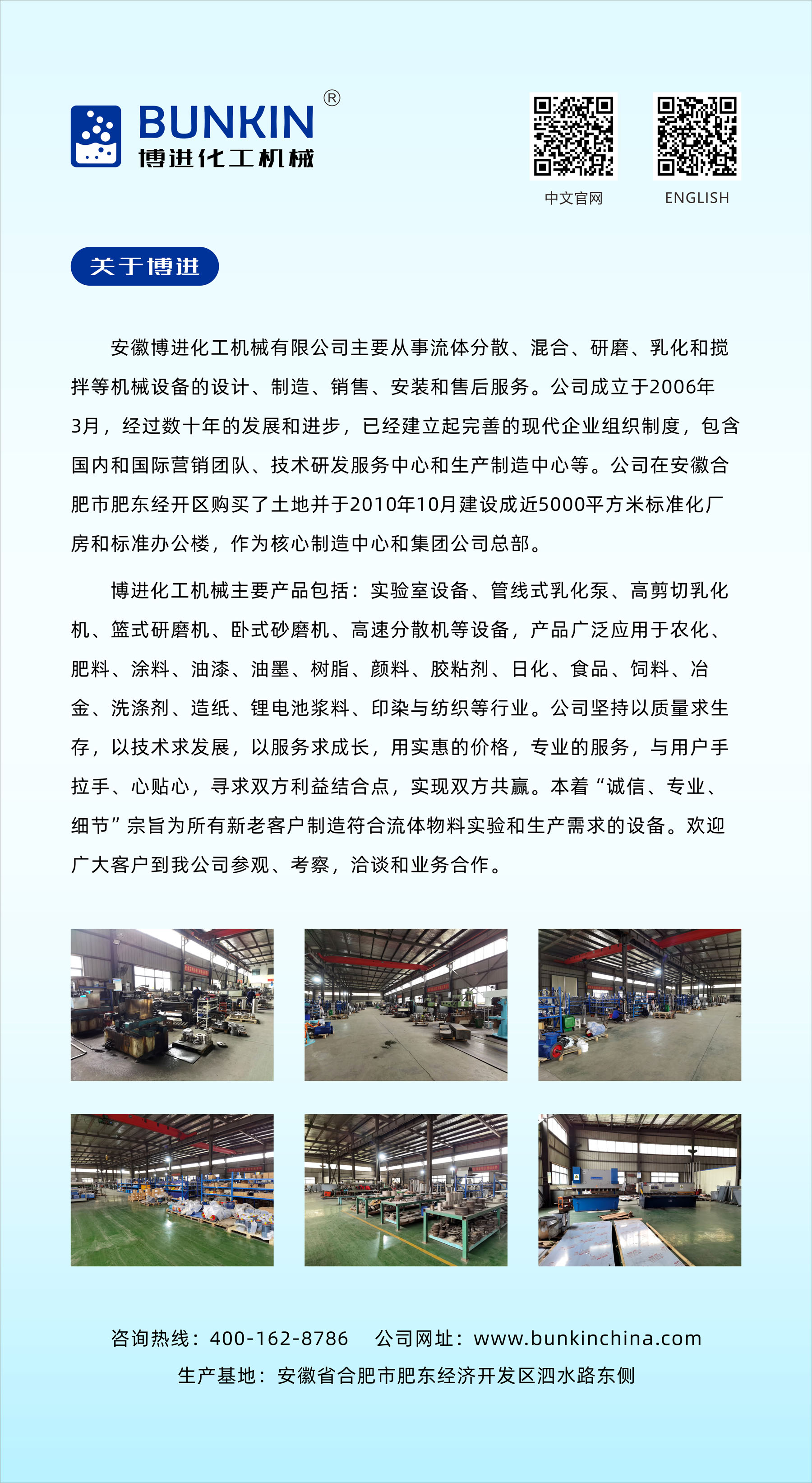安徽博进化工机械有限公司主要从事流体分散、混合、研磨、乳化和搅拌等机械设备的设计、制造、销售、安装和售后服务。公司成立于2006年3月,经过数十年的发展和进步,已经建立起完善的现代企业组织制度,包含国内和国际营销团队、技术研发服务中心和生产制造中心等。公司在安徽合肥市肥东经开区购买了土地并于2010年10月建设成近5000平方米标准化厂房和标准办公楼,成立安徽博尚化工设备有限公司作为核心制造中心和集团公司总部。
