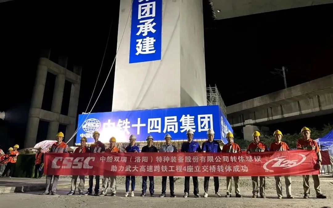 在中国船舶七二五所中船双瑞(洛阳)特种装备股份有限公司(简称双瑞特装)提供的转体球铰支撑下,武汉至大悟高速公路上跨沪蓉线、麻武线两幅立交桥连续梁逆时针完成“关键一转”,与两天前转体的连续梁形成一条直线。