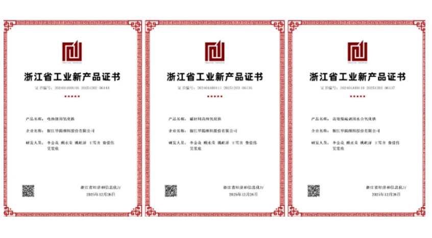 近日,华源新材自主研发的三项新产品“电池级用氧化铁”“磁材用高纯氧化铁”“高效脱硫剂用水合氧化铁”顺利通过专家验收,荣获《浙江省工业新产品证书》。